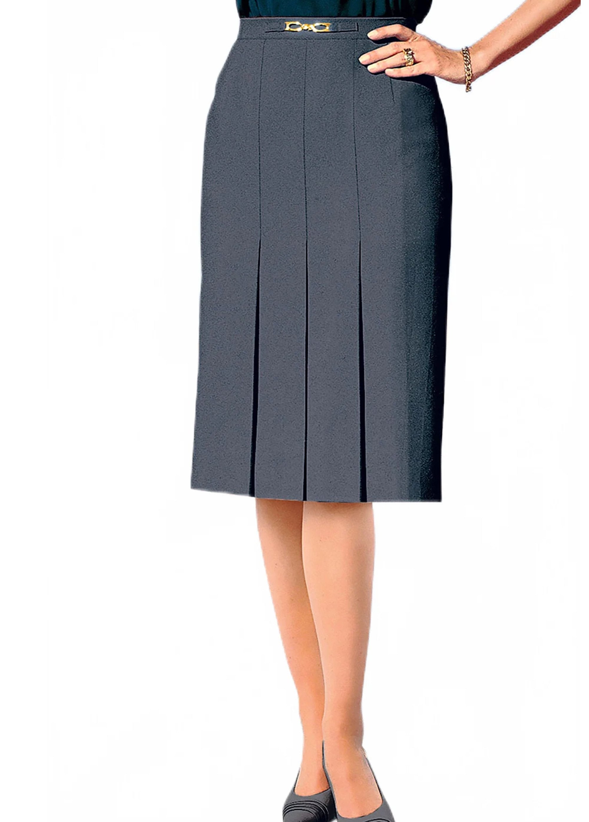 A skirt cut in a stretchy fabric that follows your movements while remaining impeccable, its line combines the well-being of an elasticated waistband on the back, the chic of a fancy buckle and the feminine ease of a set of topstitching opening into a box pleat and 2 folds lying in front. Darts at the front and back. Back closure with button and invisible zipper. Long. 65 cm approx. Washable. No need to iron. Polyester fabric.